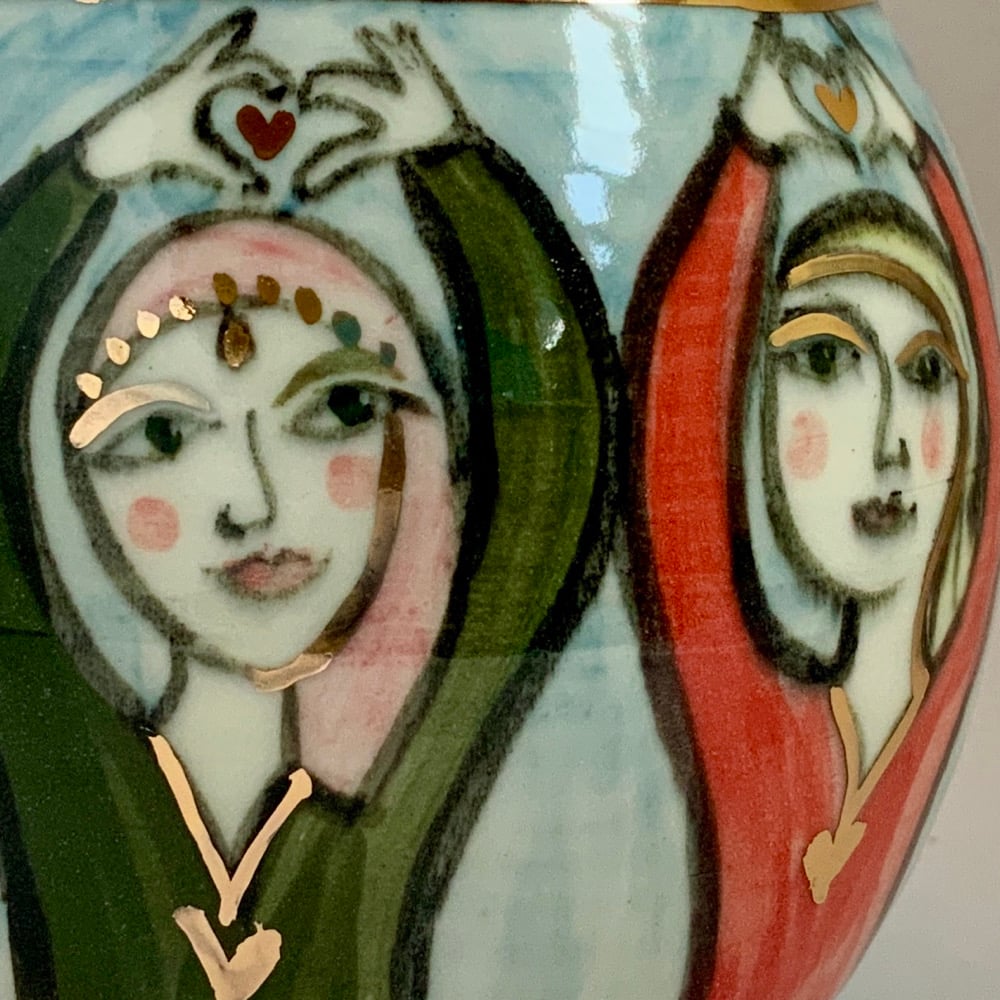 Love , six women dance around this pot their hearts held aloft united in their message of peace between all faiths and races .