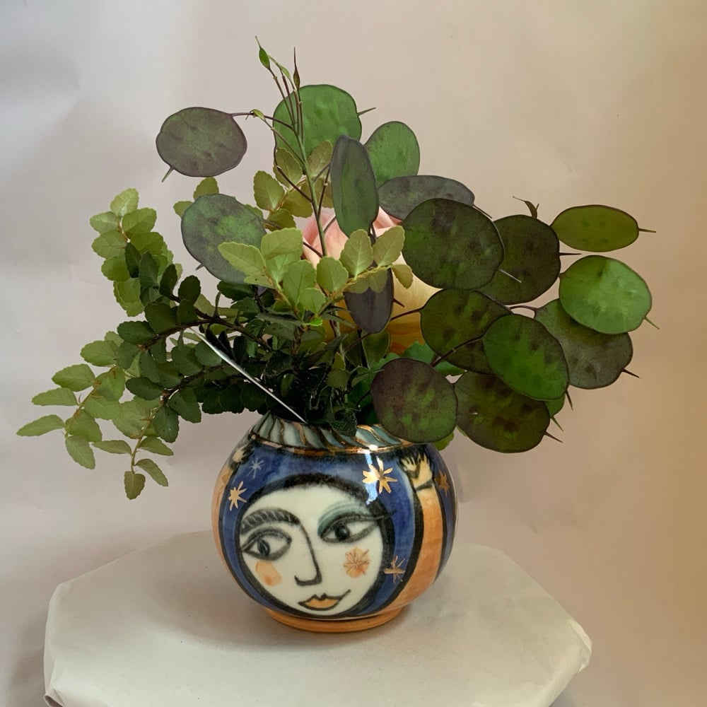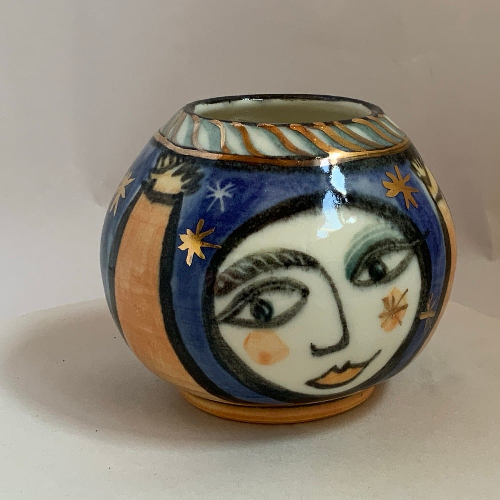 Starlit dance, a sweet little vase for flowers from the garden ,three figures dancing together under a starlight sky.
