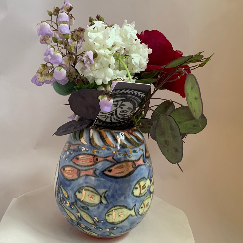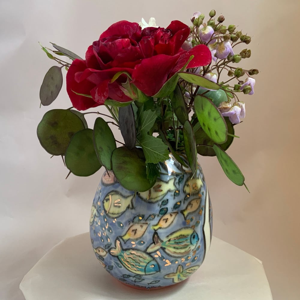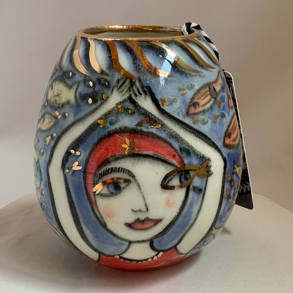 Small hand thrown turned and individually painted vase with second painting and third firing of gold lustre.